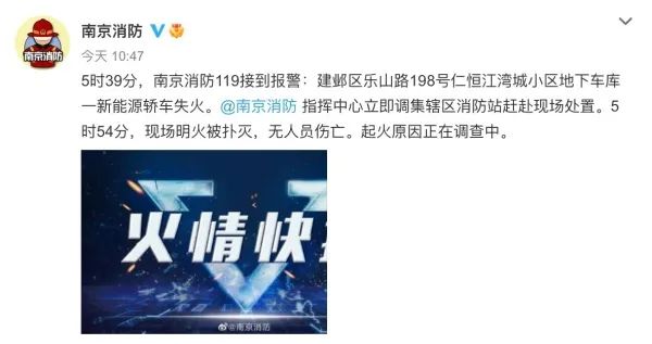 据南京消防微博显示,今日5时39分,南京消防119接到报警建邺区乐山路198号仁恒江湾城小区地下车库一新能源轿车失火。南京消防指挥中心立即调集辖区消防站赶赴现场处置。5时54分,现场明火被扑灭,无人员伤亡。起火原因正在调查中。