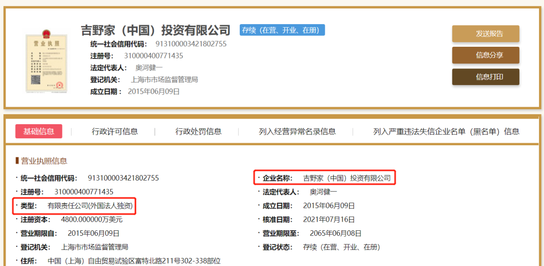 记者登录国家企业信用信息公示系统查询发现,吉野家(中国)投资有限公司为国外法人独资。吉野家(中国)投资有限公司官网显示,吉野家餐饮管理(上海)有限公司的母公司株式会社吉野家集团,于2015年6月9日在中国上海成立了新公司吉野家(中国)投资有限公司。