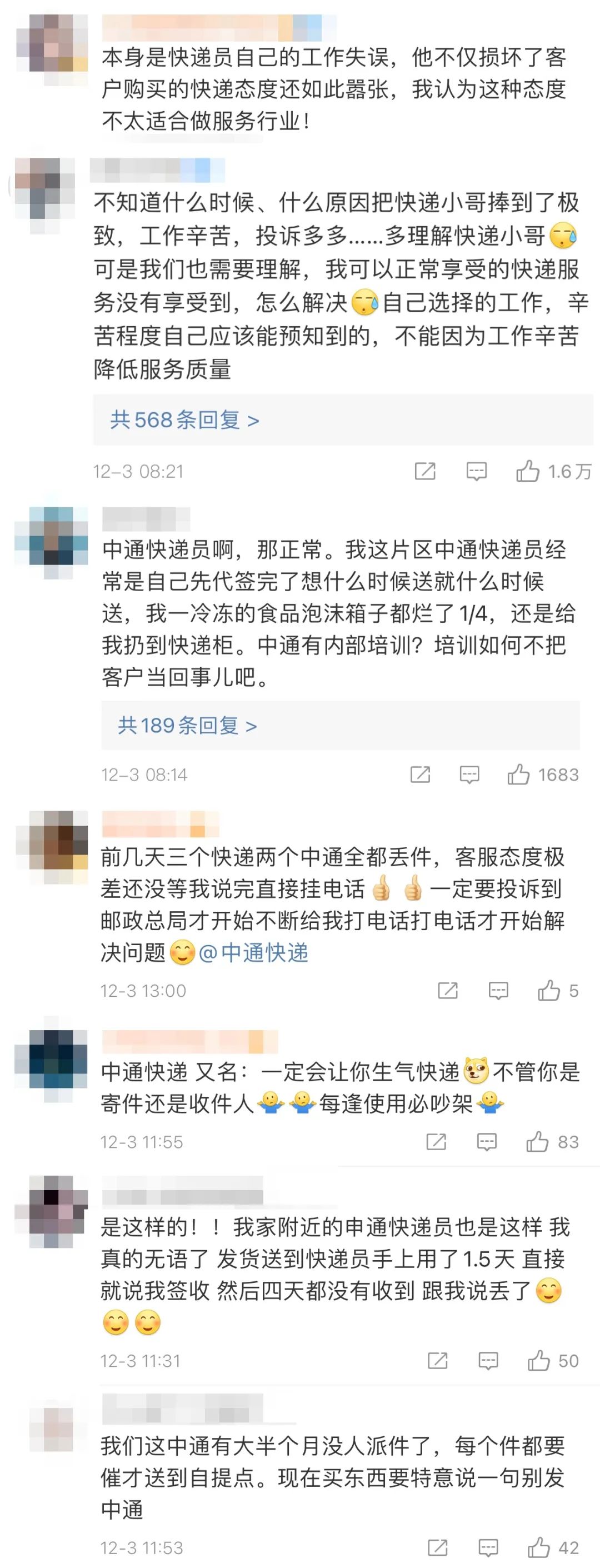 目前,微博网友对此事的讨论仍然热烈。另有众多网友表示,自己使用中通快递也曾有过不愉快的经历,希望中通加强内部管理。