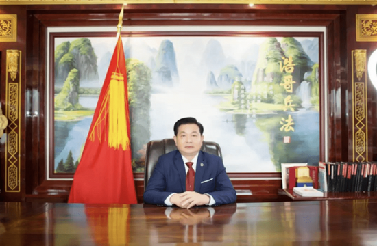 在企业官网照片中,陈浩或端坐在一张巨大、锃亮的办公桌后,背后是写着“浩哥兵法”的字画,或在红棕木质演讲台上演讲,背后是10面锦旗和陈浩个人蓝底照片。值得一提的是,陈浩办公室、演讲台与文峰整体装修如出一辙,是几乎完全相同的同款装修。