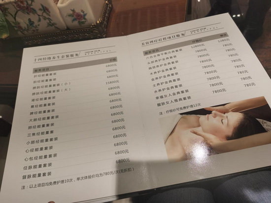在新浪科技得到的文峰价目表中,有肾经养护套餐、心经养护套餐、任脉能量套餐、督脉能量套餐等,单个套餐价位在6800元至15800元不等。店员在介绍过程中建议,任脉能量套餐、督脉能量套餐一起,再配合淋巴排毒效果更好。据悉,这三个套餐叠加,价格大约在2万元左右。