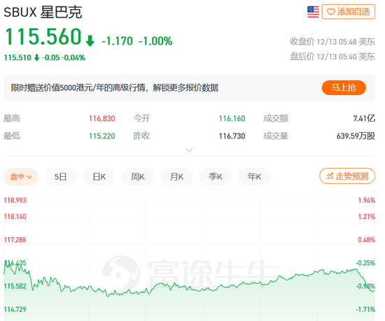 受星巴克中国更换配料标签、使用过期食材事件影响,美国时间12月13日,星巴克收盘跌1%。
