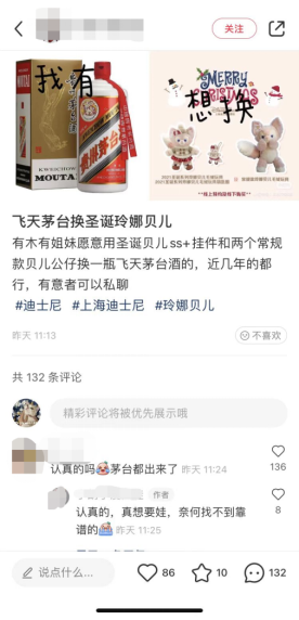 更让人想不到的是,网上还有网友发帖表示愿意用飞天茅台换圣诞玲娜贝儿。