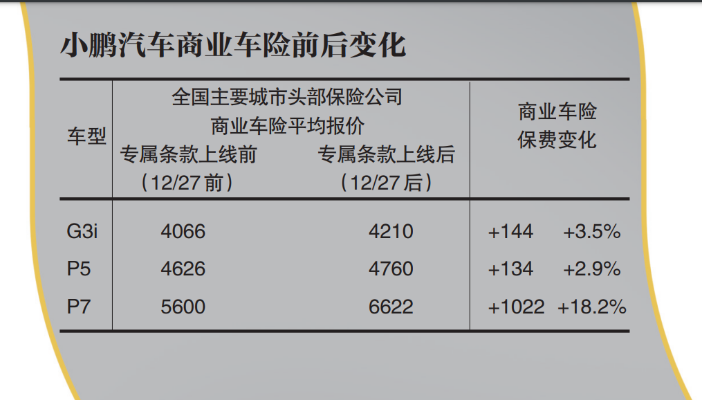 小鹏汽车方面向贝壳财经记者分享了一份数据,据2021年12月28日各保司反馈的全国保费情况,小鹏全线车型平均涨幅2.9%至18.2%不等(不同保司、不同地区、不同车型涨幅略有差异),具体金额以当地保司的报价为准。