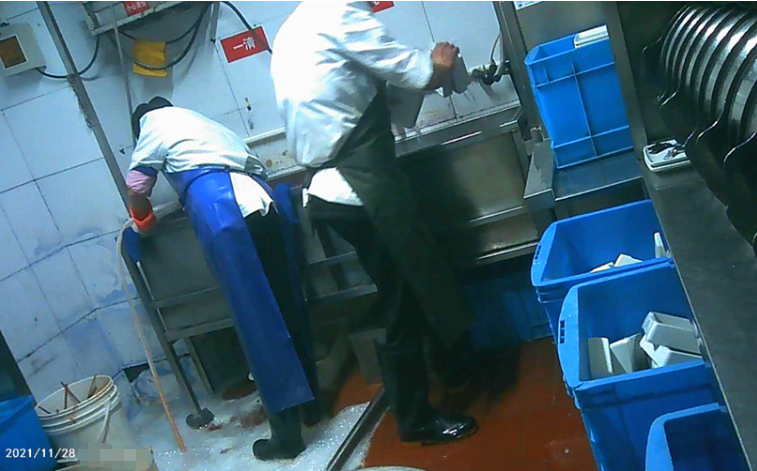 在豫园店的洗碗间,调查人员看到,店内服务人员只将餐具进行简单冲洗,就收放到蓝色餐具箱子备用。这些餐具没有经过消毒程序,更有甚者,一名女服务人员用餐盘掏厨余垃圾。