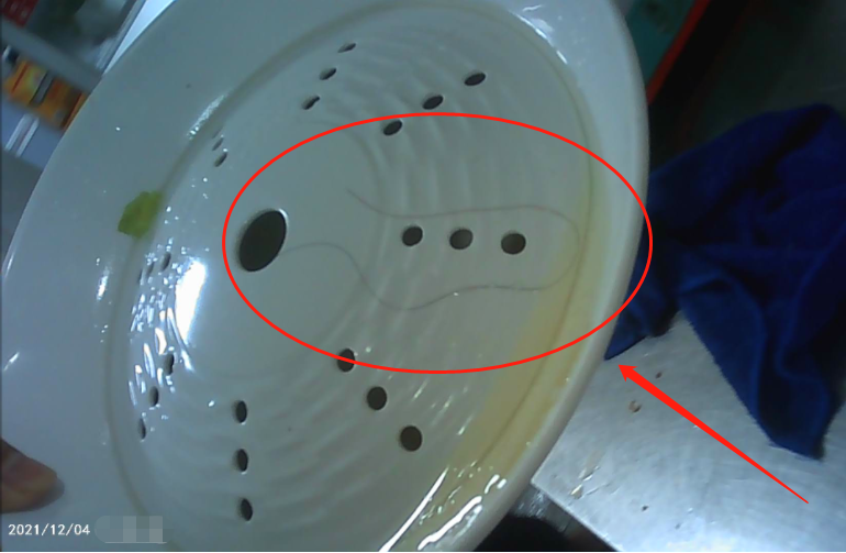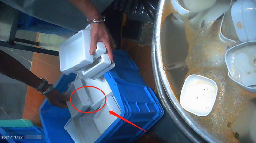 2021年11月27日中午,调查人员来到傣妹火锅上海豫园店后厨,只见该店店员正在收拾餐具,餐盘上分明有一只黑色虫子。经询问,店员表示,餐厅每晚都要打药,应该是有死掉的虫子掉落在了餐盘上。解释之余,还不忘催促调查人员把蓝箱子推过去,她要洗一下。不一会儿,一盘装有未动食材的餐品被客人退回,原因是盘子中有虫。