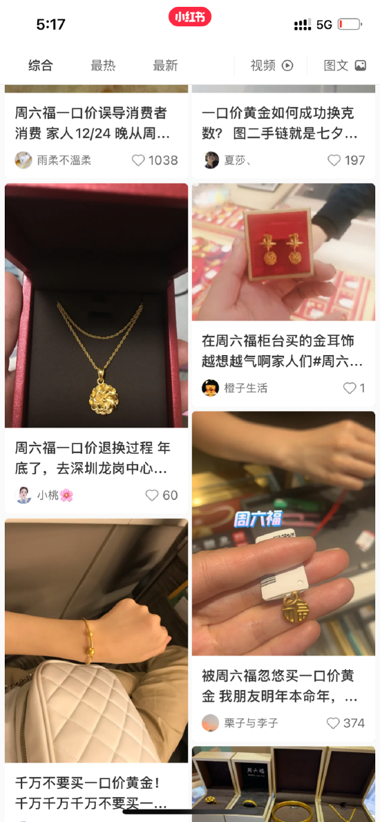 在小红书上,关于周六福一口价黄金的吐槽贴,有600多条。