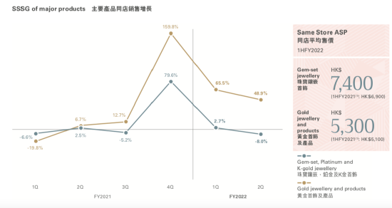 周六福财报显示,其2022财政年度上半年同店销售增长为56.6%。其中,黄金首饰及产品平均售价由2021财政年度上半年的5100港元增至2022财政年度上半年的5300港元。
