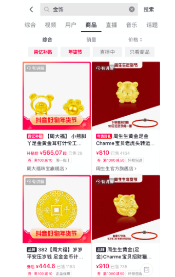 同时,金饰品牌在线上电商的销售也在逐年增加。淘宝、抖音等直播平台上,周大福、周大生等主流金饰品牌早已入驻。