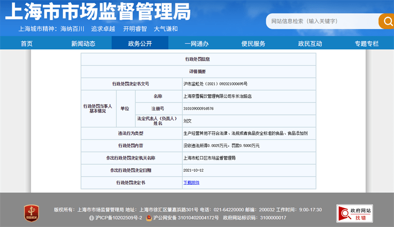 据上海市市场监督管理局网站消息,2021年10月,上海奈雪餐饮管理有限公司东长治路店(以下简称“奈雪的茶东长治路店”)因被抽样的金色山脉宝藏茶的菌落总数项目不合格,违反了《中华人民共和国食品安全法》相关规定,构成了经营不符合食品安全标准的食品的行为,被上海市虹口区市场监督管理局罚款5000元,并没收违法所得25元。