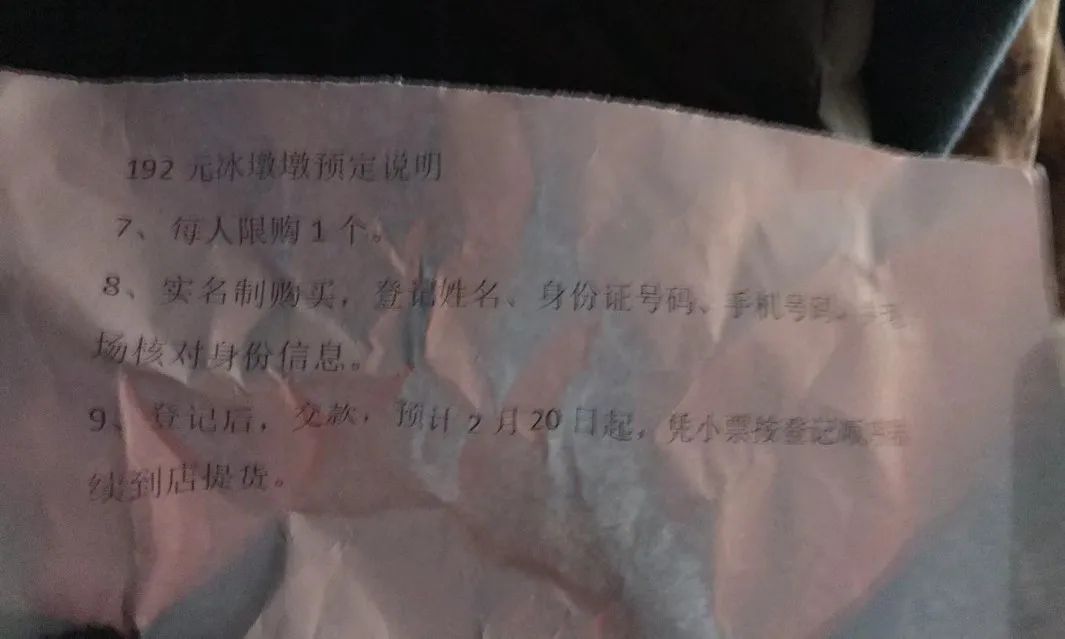 杨先生告诉记者,“按理说自己从前一天开始排,第二天上午可以买得到‘冰墩墩’。”但是8日凌晨4点左右,特许商品旗舰店工作人员给排队的市民发了一张预定192元“冰墩墩”的纸条,登记交款后,预计2月20日起,凭小票按登记顺序陆续到店提货。