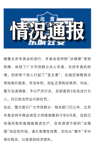2月8日,北京东城公安微信公众号通报了一则情况。随着北京冬奥会的进行,冬奥会吉祥物“冰墩墩”受到热捧,体现了广大市民群众关心冬奥、支持冬奥的热情。但却有个别人打起了“歪主意”,在指定销售网点等地高价倒卖,非法牟利,扰乱正常购买秩序。对此,警方迅速调查,予以严厉打击,目前查获3名违法行为人,均已依法作出行政处罚。