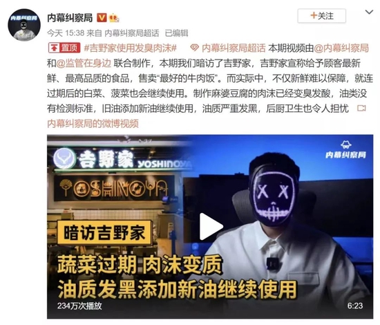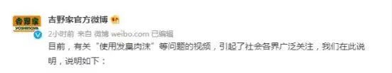 此前,有自媒体平台发布调查视频,曝光吉野家一门店疑似使用过期蔬菜、肉沫发臭等问题,对此,吉野家官方微博火速回应涉事餐厅并非公司运营,引发网友热议。