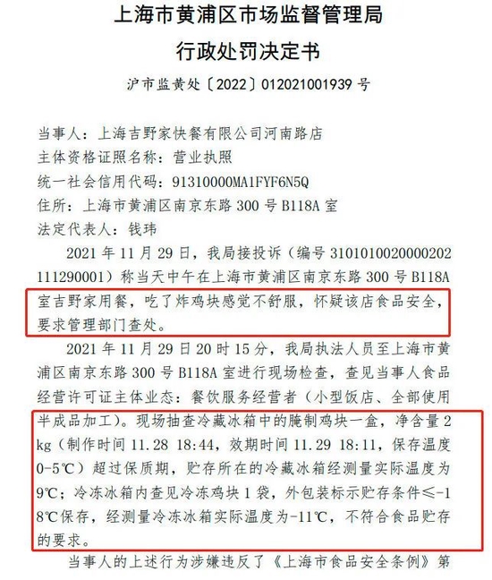 近日,上海吉野家河南路店一名顾客在店铺内用餐,吃完炸鸡块感觉不舒服,经执法人员检查发现,店内冷藏冰箱中的1盒腌制鸡块超过保质期、1袋冷冻鸡块贮存温度不符合要求。