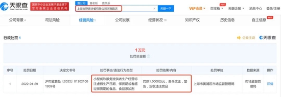 天眼查App显示,因生产经营超过保质期的食品,上海吉野家快餐有限公司河南路店被上海市黄浦区市场监督管理局罚款1万元。