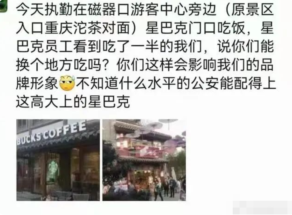 帖中发布的一张朋友圈截图内容显示为:“今天执勤在磁器口游客中心旁边(原景区入口重庆沱茶对面)星巴克门口吃饭,星巴克员工看到吃了一半的我们,说你们能换个地方吃吗?你们这样会影响我们的品牌形象。不知道什么水平的公安能配得上这高大上的星巴克”。