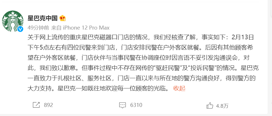 2月13日,有网友在社交平台发帖:@星巴克中国 @星巴克重庆 你们好大的官威啊。@平安重庆 的民警不配在你门口吃饭是不是?