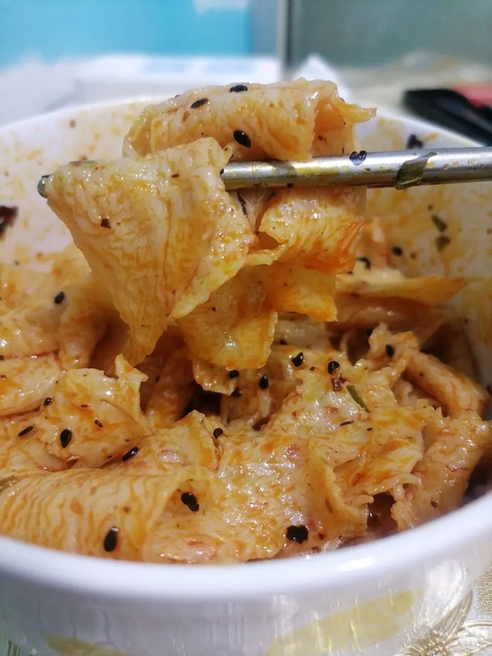 根据当事人16日在互联网上陈述:打开阿宽的红油面皮时,发现塑封膜里面包着一坨黑色的东西,上面有毛还有一块发霉的地方,很像老鼠肉。