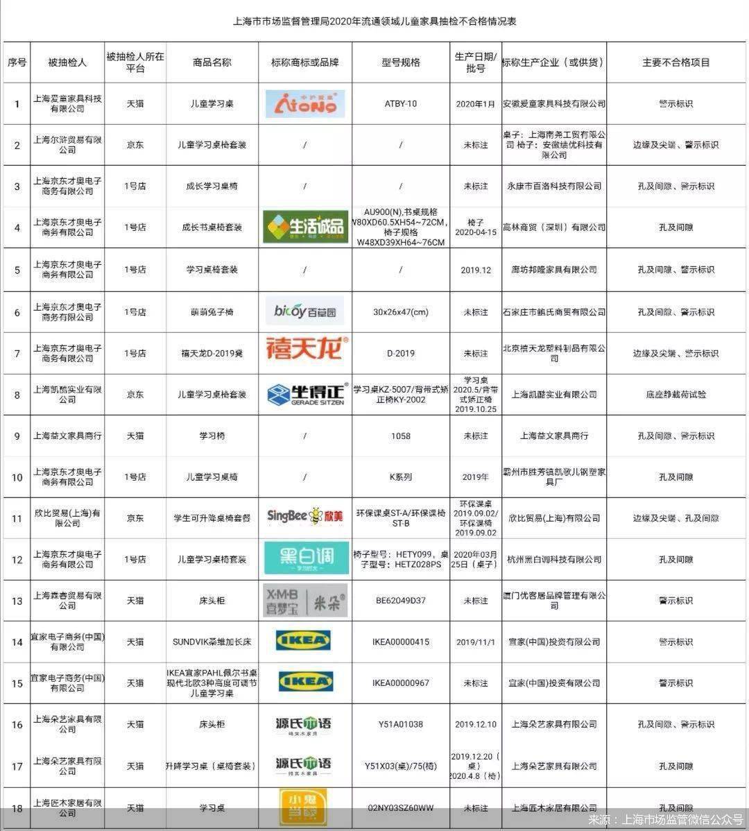 此前2020年1月6日,北京市市场监督管理局发布抽检结果,标称生产企业为“宜家瑞典有限公司,境内授权代理机构:宜家(中国)投资有限公司”、产地为“瑞典(代理机构:上海)”、标称商标为“IKEA”、规格为“货号:503.270.67 1(2),503.207.67 2(2)”、型号为“奥菲”、生产日期或批号为“座和靠背20180914,其他配件(检样20180919,备样20180921)”、等级为“合格品”的一款“奥菲儿童书桌椅”被检出“警示标识”项目不合格。