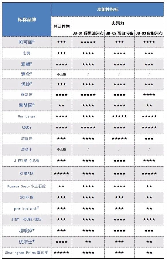 其中,KINBATA的总活性物最高,达到16%,高于《衣料用液体洗涤剂》(QB/T 1224—2012)中对普通洗衣液的要求(≧15%),馨梦园®的总活性物相对最低,只有0.5%。壹念®、洁骑士这两个样本的总活性物不符合其明示的产品执行标准。因此也未纳入本次比较试验评星。