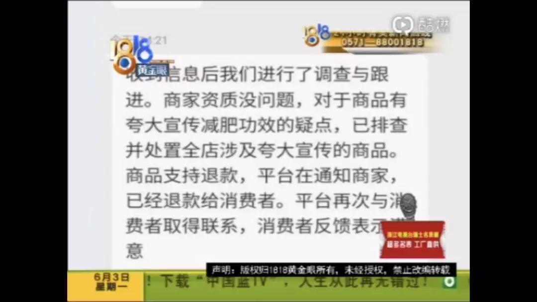 随后,淘宝给了回复说该商家的资质没有问题,对于商品有夸大宣传减肥功效的一点,已排查并处置全店涉及夸大宣传的商品,并支持退款。随后当事人程女士也收到了退款。