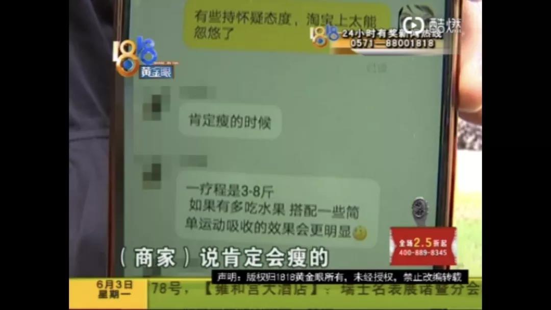 于是程女士去咨询了商家,商家的回复是一定会瘦。并建议她不要吃辛辣和高热量的食物,建议多喝水。程女士也表示自己很容易满足这些条件。