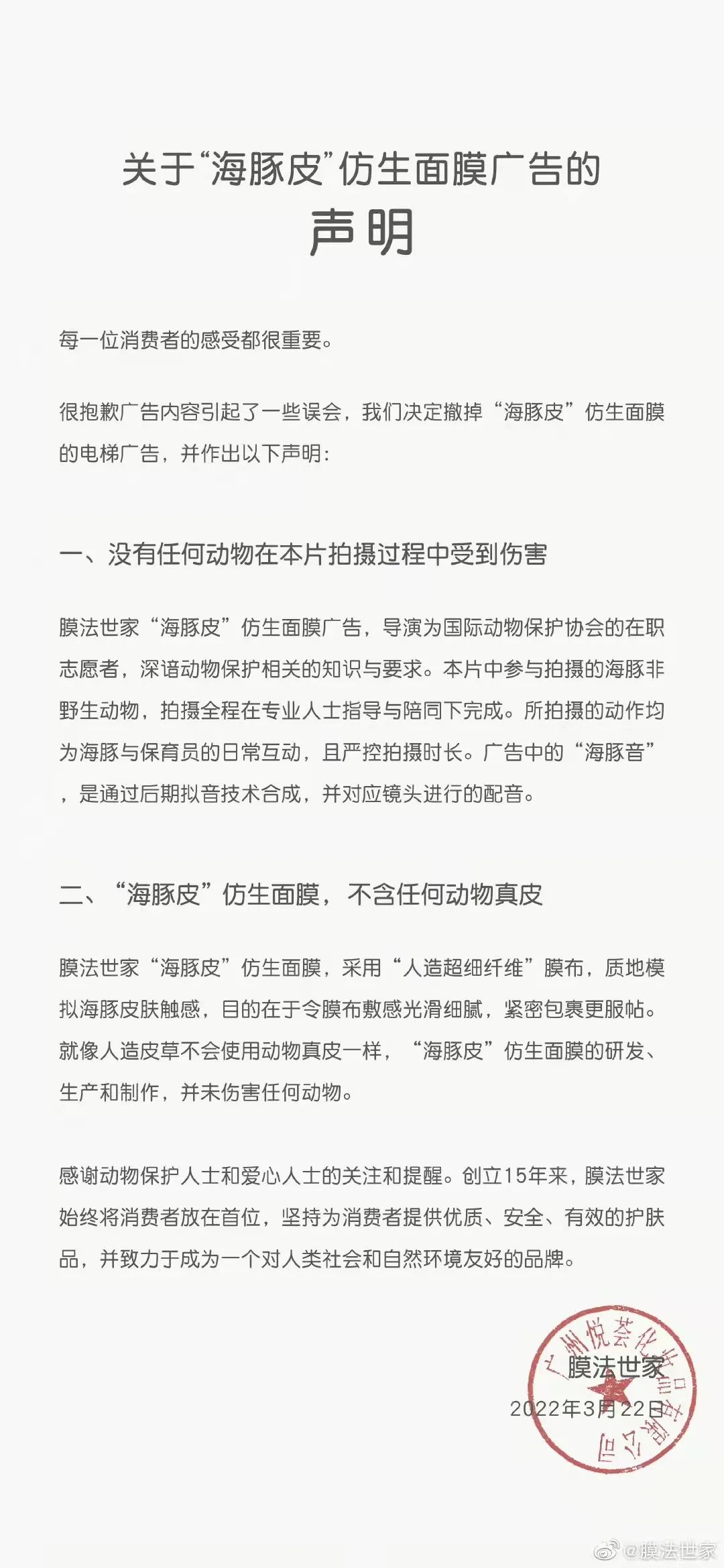 膜法世家表示,没有任何动物在本片拍摄过程中受到伤害。该广告导演为国际动物保护协会的在职志愿者,深谙动物保护相关的知识与要求。本片中参与拍摄的海豚非野生动物,拍摄全程在专业人士指导与陪同下完成。所拍摄的动作均为海豚与保育员的日常互动,且严控拍摄时长。广告中的“海豚音”,是通过后期拟音技术合成,并对应镜头进行的配音。