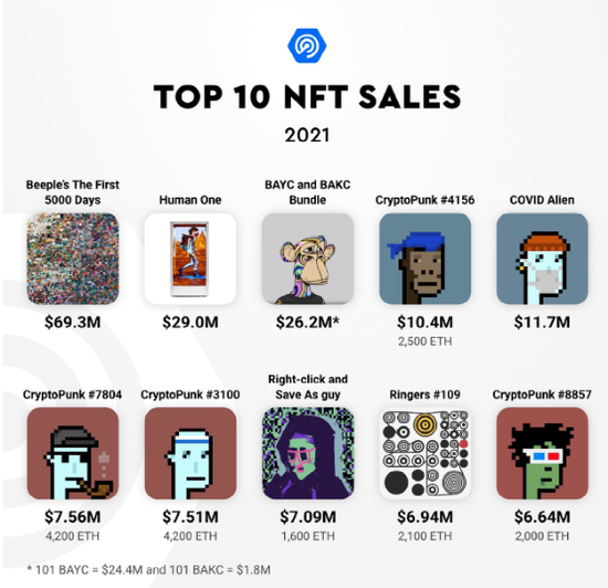 DappRadar数据显示,2021 年NFT的交易额超过了 230 亿美元,其中排名前100的NFT藏品的底价市值达167亿美元。