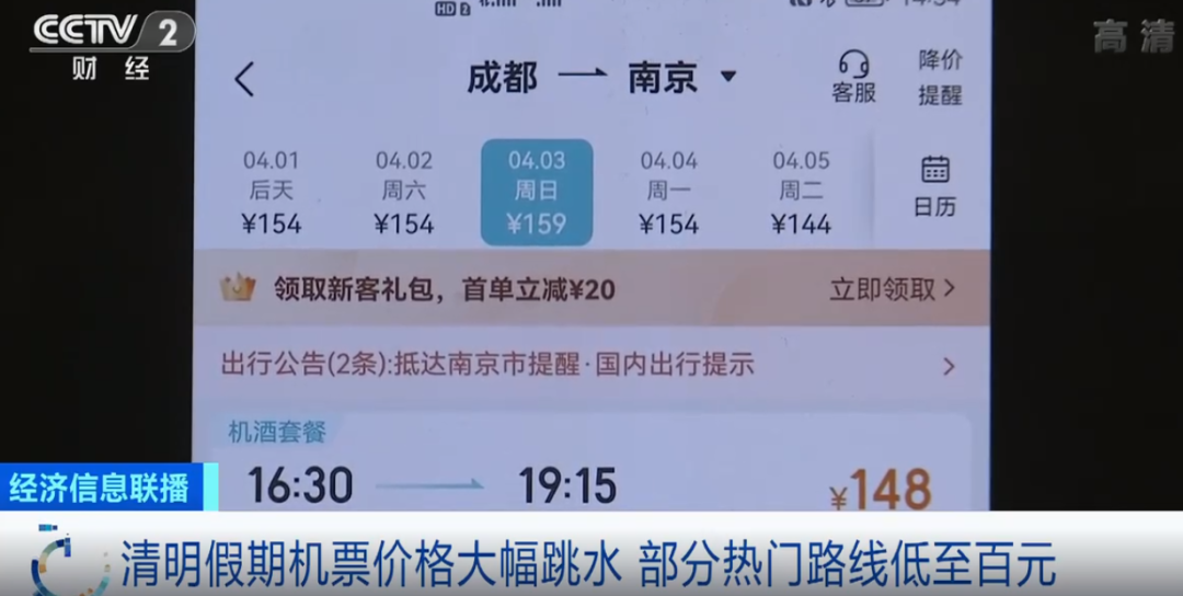 某机票订购平台公共事务高级经理 刘婷:清明假期期间经济舱平均支付价格为546元,同比去年下降近两成,今年清明假期机票为近三年最低价格。