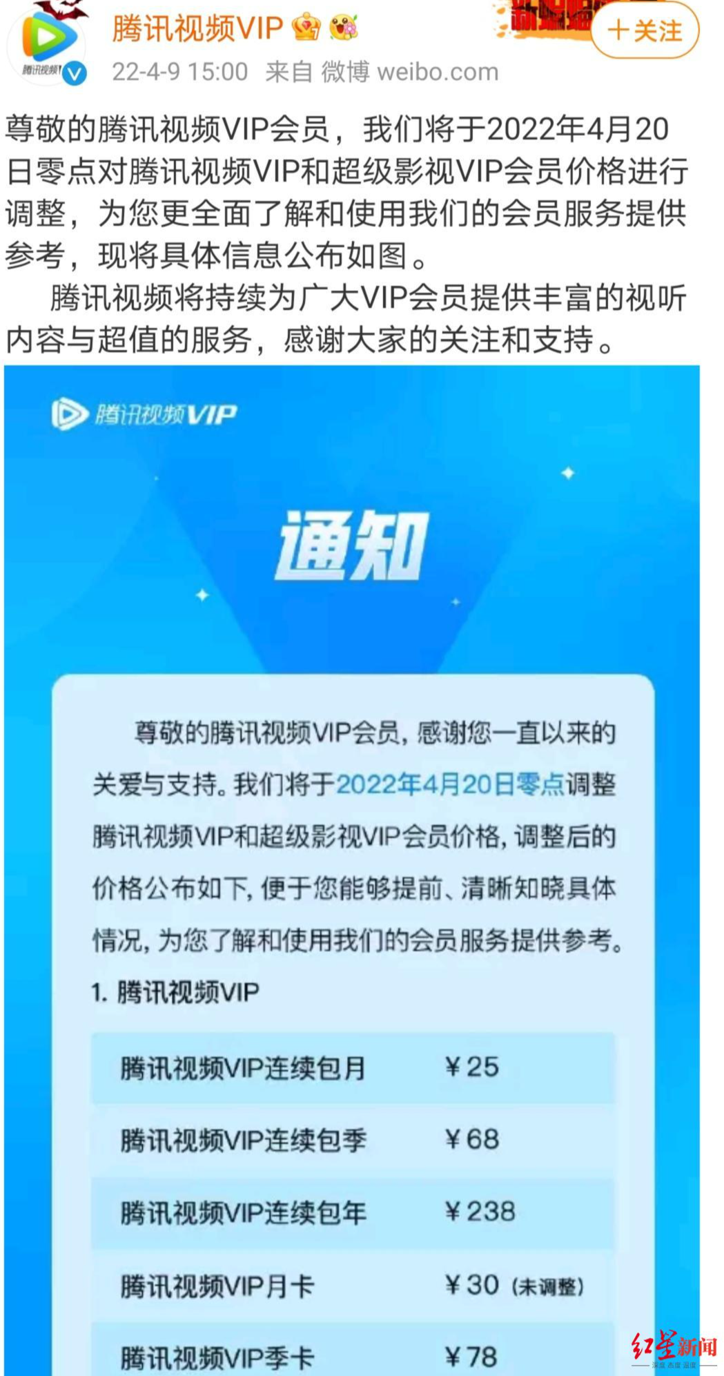 继去年4月会员费涨价后,4月9日,腾讯视频官方宣布,将在今年4月20日零点,对腾讯视频VIP及超级影视VIP会员价格再次进行调整。