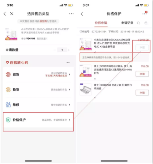 然后找到“价格保护”,点击进入最后一个界面,点击“申请”即可。如下图所示: