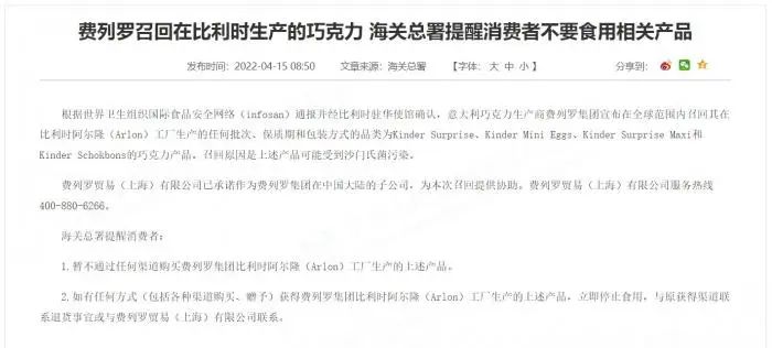 公告指出,根据世界卫生组织国际食品安全网络通报,并经比利时驻华使馆确认,意大利巧克力生产商费列罗集团宣布在全球范围内召回其在比利时阿尔隆(Arlon)工厂生产的任何批次、保质期和包装方式的品类为Kinder Surprise、Kinder Mini Eggs、Kinder Surprise Maxi和Kinder Schokbons的巧克力产品。召回原因是上述产品可能受到沙门氏菌污染。