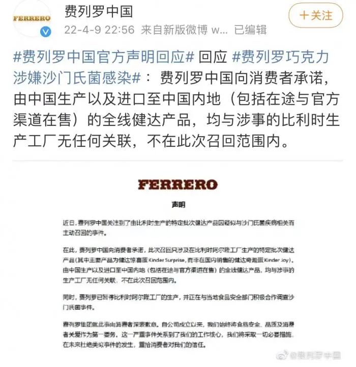 4月9日,费列罗贸易(上海)有限公司通过其官方微博“费列罗中国”发布声明,承诺由中国生产以及进口至中国内地(包括在途与官方渠道在售)的全线健达产品,均与涉事的比利时生产工厂无任何关联,不在此次召回范围内。