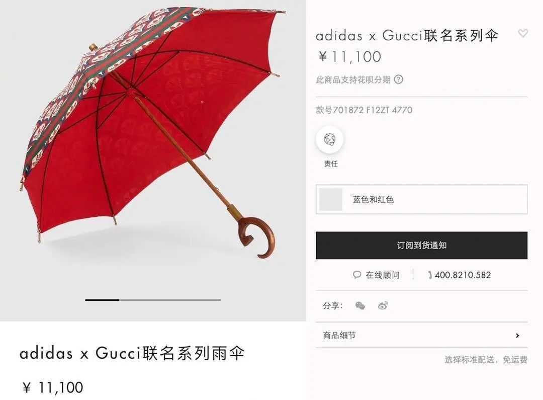 Gucci官网显示,这把伞上印满了Gucci和阿迪达斯的LOGO,红蓝撞色很符合Gucci一贯的风格。造型方面,有8根伞股,63厘米,木轴直径14-16厘米,且明确在介绍中标注了“不防水”。