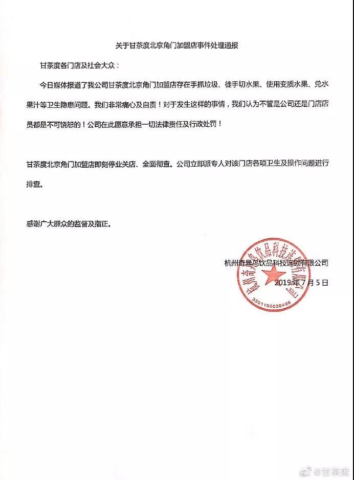 目前,甘茶度回应称已成立专项小组调查事实详情,并于今天中午12点46分通过官方微博发出通报,表示“非常痛心及自责”,“愿意承担一切法律责任和行政处罚”全文如下: