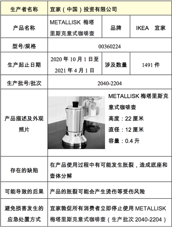宜家(中国)投资有限公司将于2022年6月8日至2022年9月7日召回2020年10月1日至2021年4月1日期间生产的型号为00360224、生产批次为2040-2204的“IKEA 宜家”METALLISK 梅塔里斯克意式咖啡壶,涉及1491件。