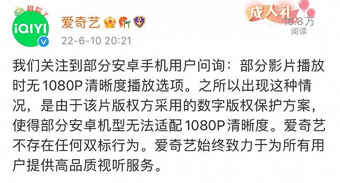 6月10日,@爱奇艺 发文称,关注到部分安卓手机用户问询:部分影片播放时无1080P清晰度播放选项。之所以出现这种情况,是由于该片版权方采用的数字版权保护方案,使得部分安卓机型无法适配1080P清晰度。爱奇艺不存在任何双标行为。
