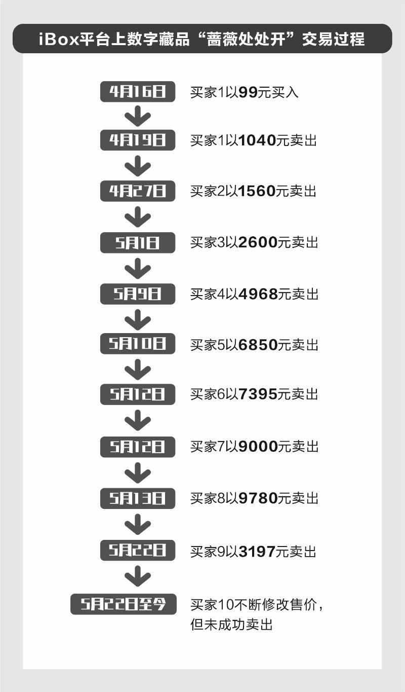 此后又经过多轮交易,5月10日,买家6以6850元的价格买入,并于两天后以7395元的价格卖出。仅仅过去一天后,买家8又以9000元的价格买入,并以9780元的价格卖出。