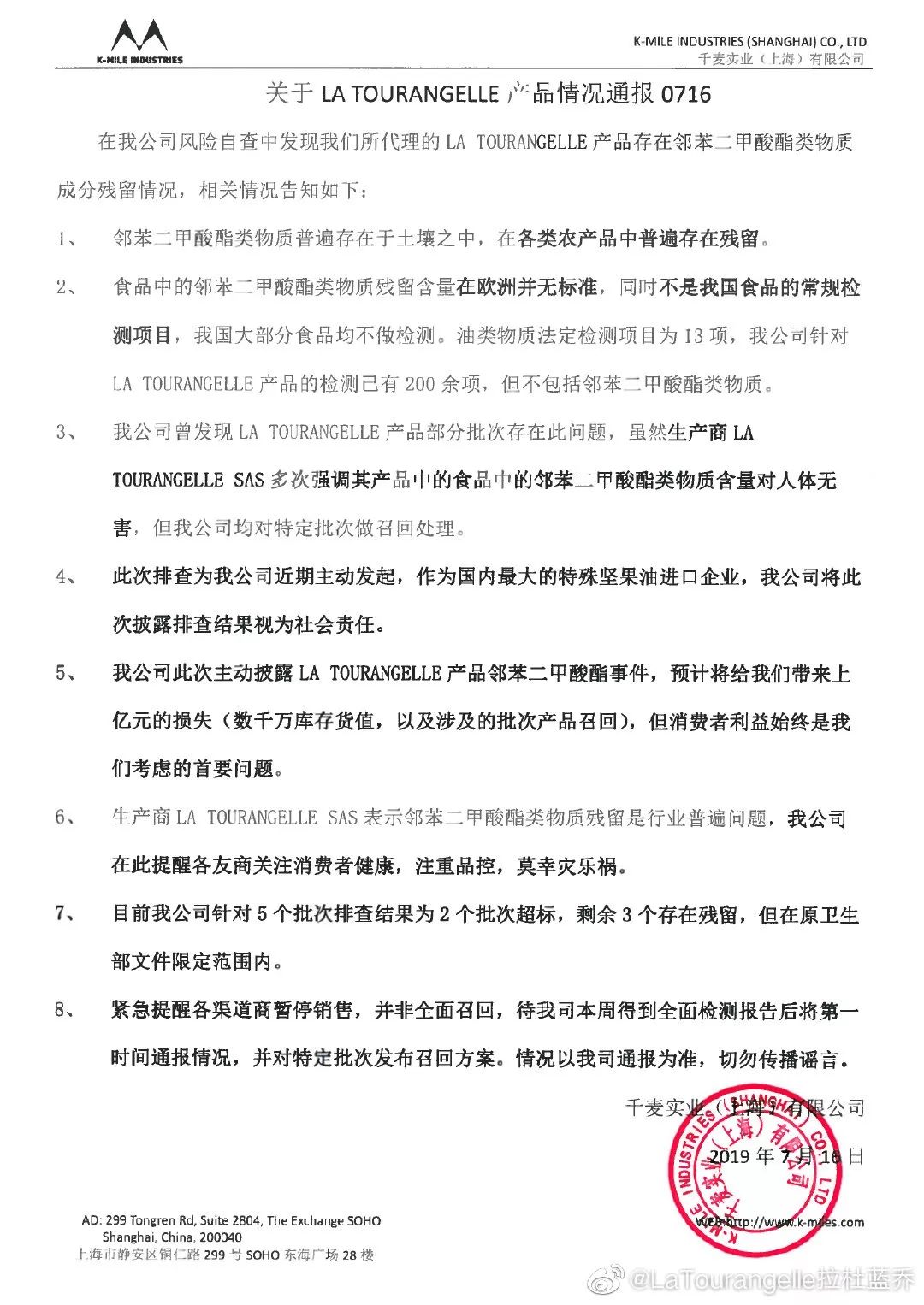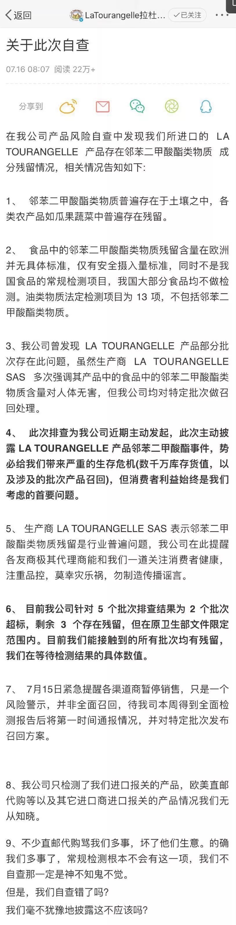 上午10点17分,微博“LaTourangelle拉杜蓝乔”又发布一则《关于LaTourangelle产品情况通报》,在通报中,该公司称,针对LaTourangelle产品的检测已有200余项,但不包括邻苯二甲酸酯类物质,并且称,该公司曾发现LaTourangelle部分产品存在此问题,虽然生产商多次强调其产品中的食品中的邻苯二甲酸酯类物质含量对人体无害,但公司均对特定批次做召回处理。