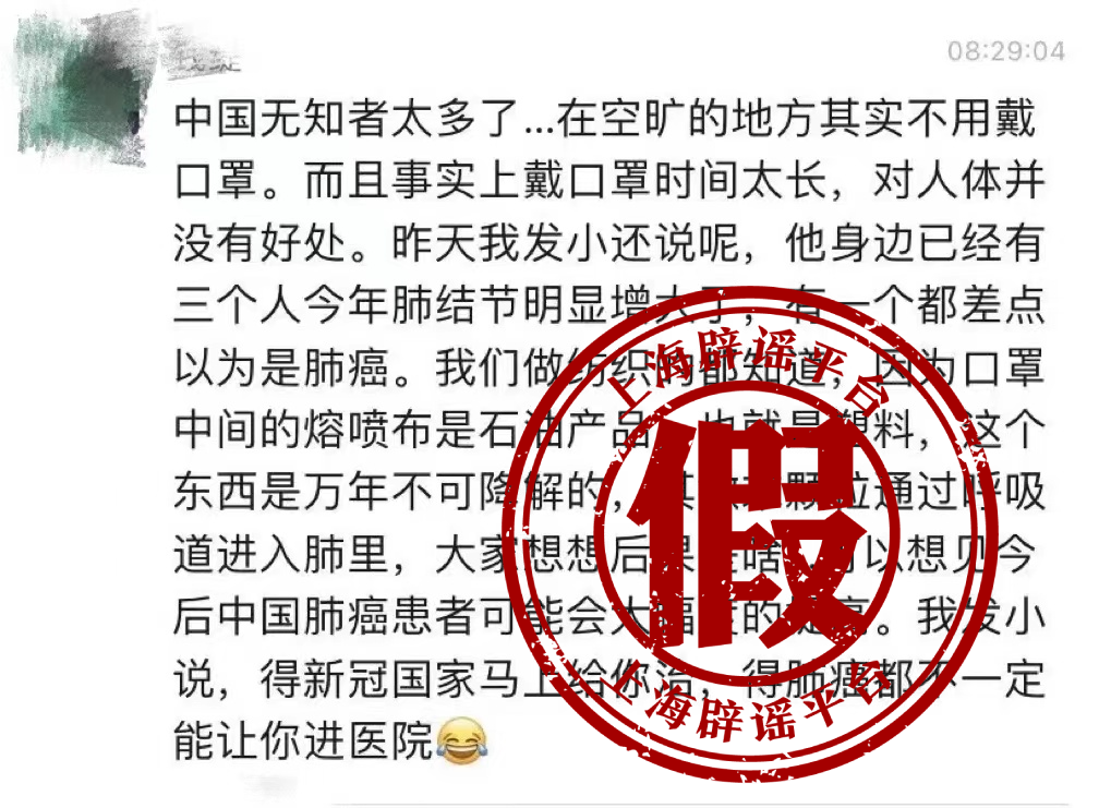 近日,上海辟谣平台接到网友留言,希望求证关于“长时间戴口罩肺结节明显增大”的说法是否正确。从网传说法看,有人将口罩的危害归咎于口罩中间层熔喷布,指出熔喷布为石油产品,“微末颗粒通过呼吸道进入肺里”,所以有危害。