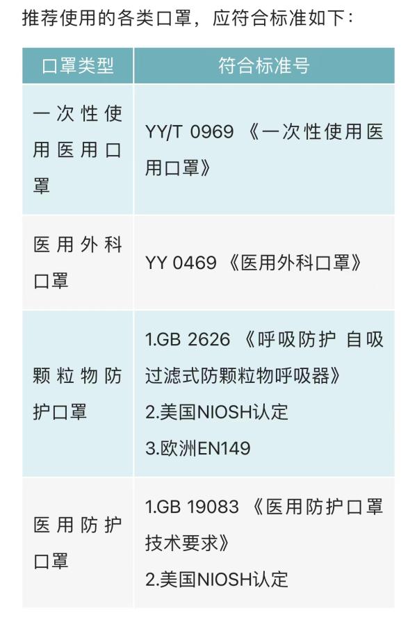 每款口罩都有其对应的产品标准。如,一次性使用医用口罩,对应的标准是“yy/t 0969 《一次性使用医用口罩》”;医用外科口罩对应的标准是“yy 0469 《医用外科口罩》”,kn95口罩或n95口罩对应标准“gb 2626 《呼吸防护 自吸过滤式防颗粒物呼吸器》”或“美国niosh认定”或“欧洲en149”;医用防护口罩对应标准“gb 19083 《医用防护口罩技术要求》”或“美国niosh认定”。