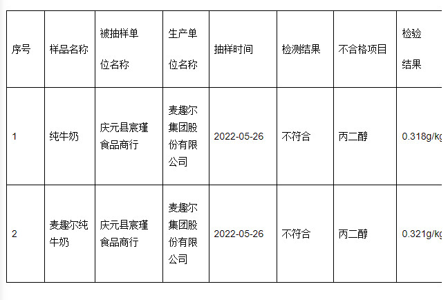 近日,浙江省庆元县市场监管局公示2022年第4期食品抽检检验情况。本期检出标称麦趣尔集团股份有限公司生产的2批次纯牛奶不合格,不合格项目为丙二醇。