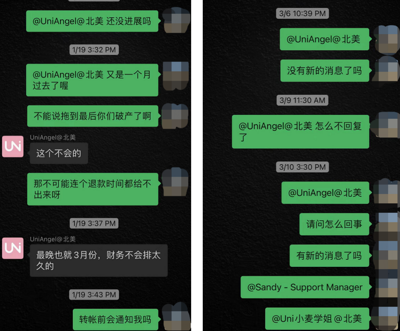 张俊杰也就退款问题和工作人员多次沟通,对方一拖再拖,不停承诺新的退款时间但从未履行,后期便不再回复。