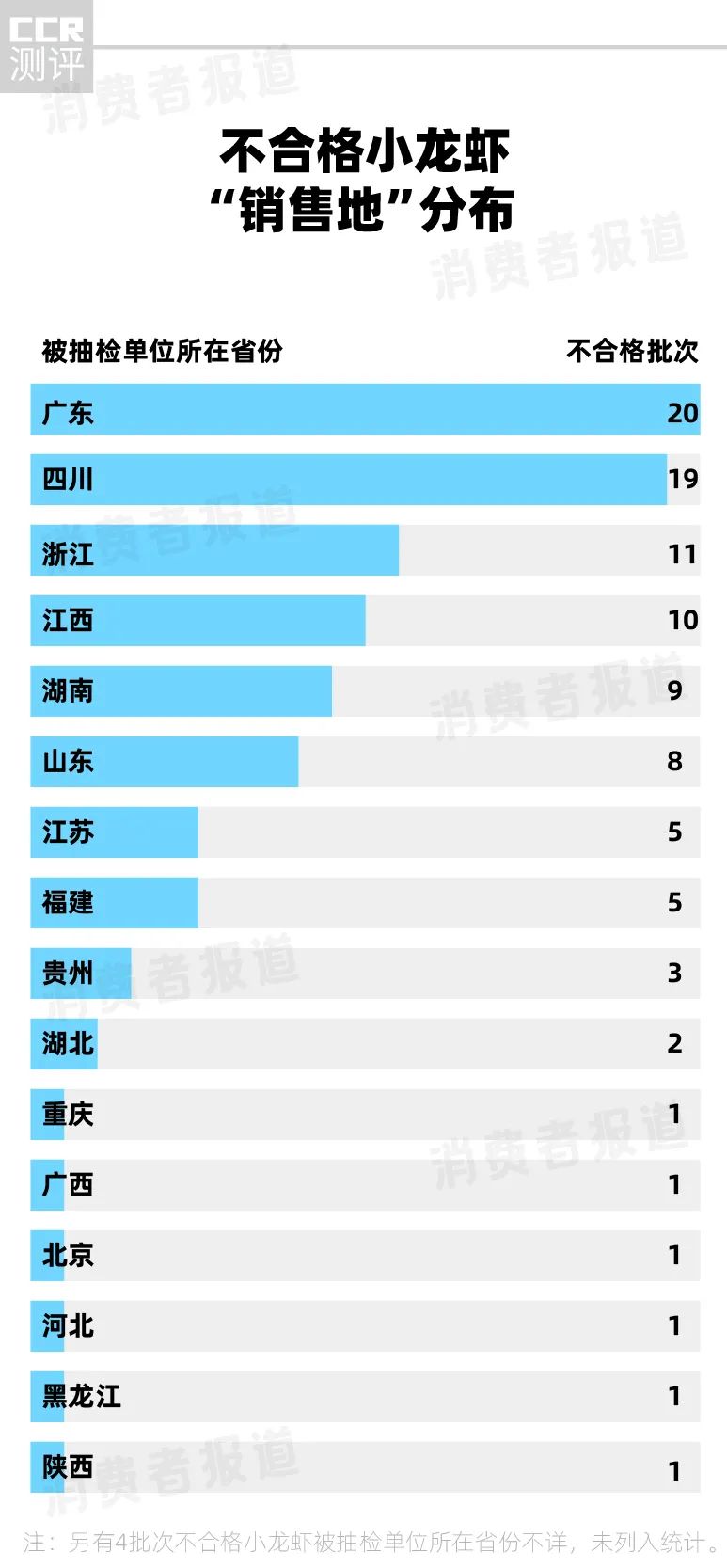 此次抽检发现的不合格小龙虾,被抽检单位(销售地)来自广东、四川、浙江、江西、湖南等16个省份,其中不合格出现频率较高的是广东、四川、浙江和江西。