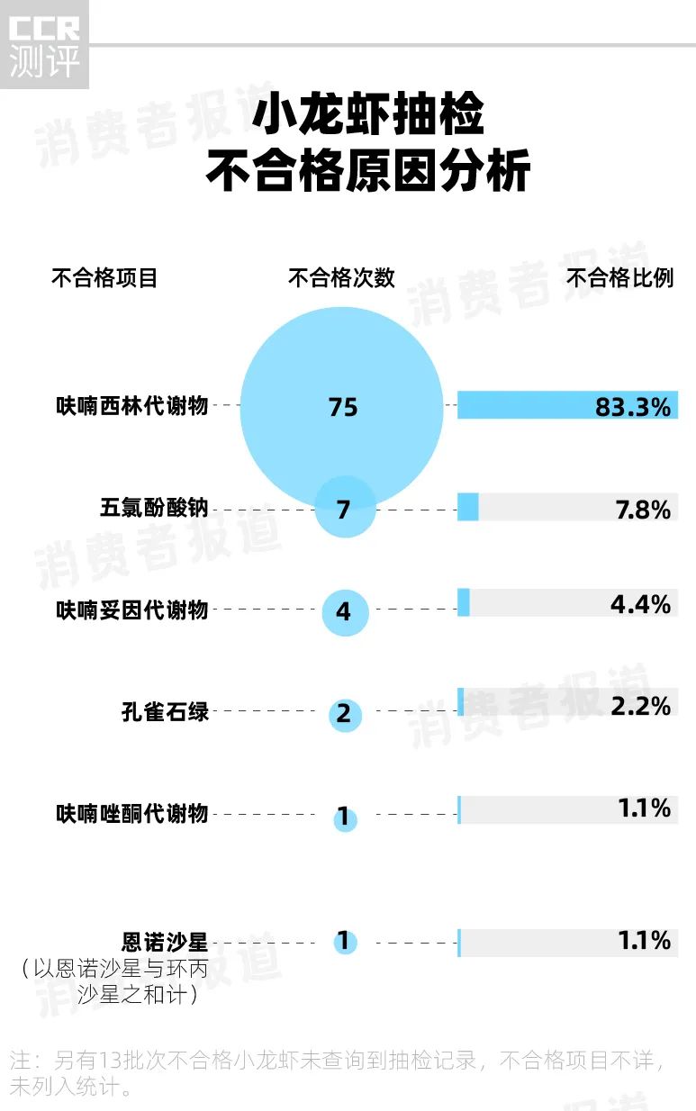 抽检数据显示,102批次不合格小龙虾最突出的问题是检出兽药,包括呋喃西林代谢物、五氯酚酸钠、呋喃妥因代谢物、孔雀石绿、呋喃唑酮代谢物、恩诺沙星,前5种均是国家明令禁止使用的药物。