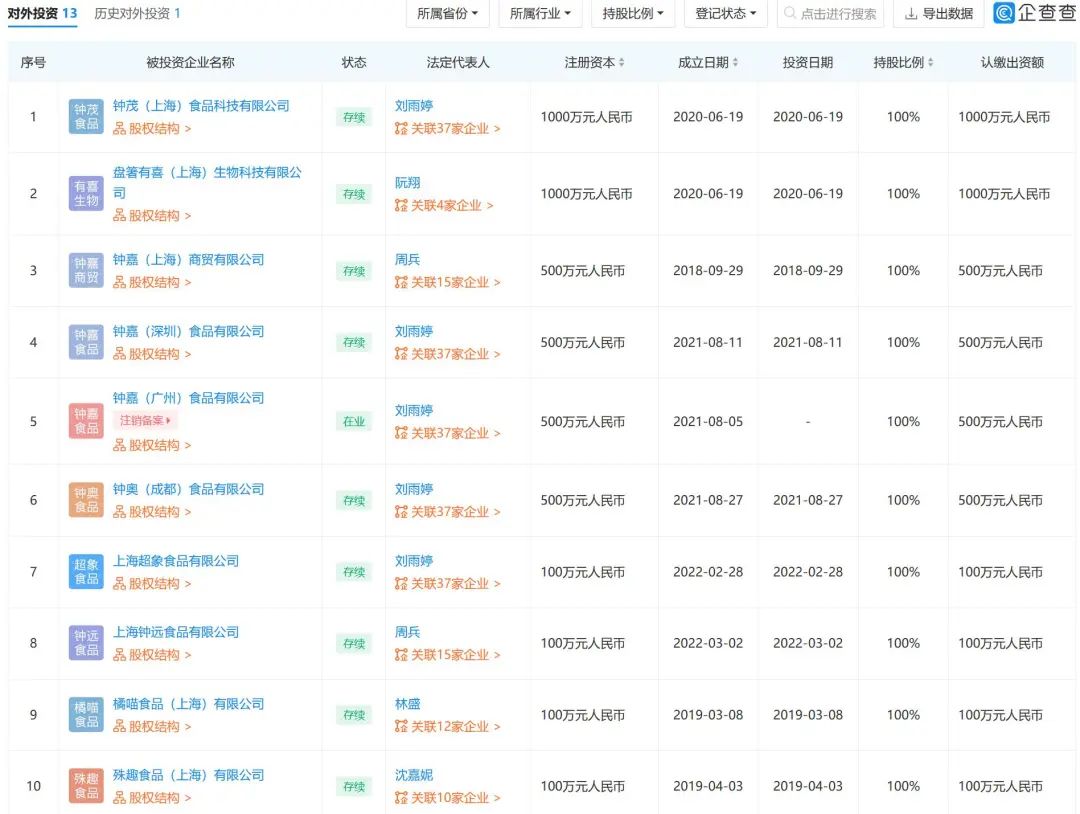 企查查显示,林盛拥有11家公司的实际控制权,包括上海盛治广告有限公司、钟薛高创业投资(深圳)有限公司等。5月26日,钟薛高食品(上海)有限公司发生工商变更,注册资本由约6.03亿人民币增至12.03亿人民币,增幅约99.52%。