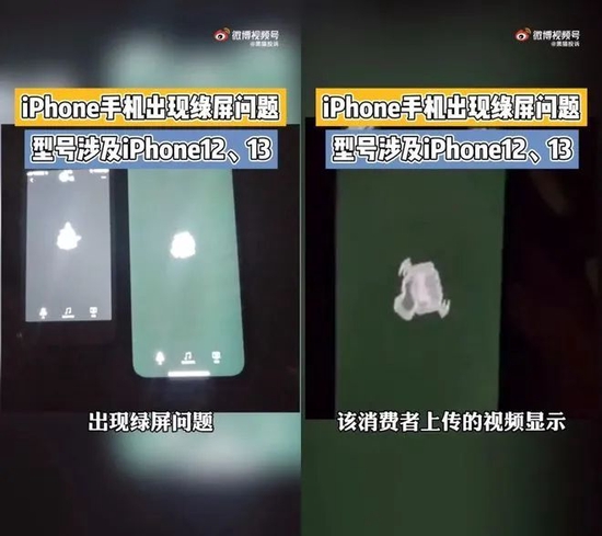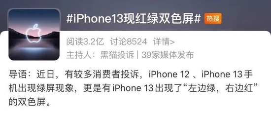 2021年12月,#iPhone 13现红绿双色屏#登上微博热搜,遭到众多网友吐槽。消费者遇到的绿屏情况各有不同,有的是屏幕上的绿色随时间逐渐加深,有的则是屏幕出现了一边绿一边红的情况,还有网友表示,自己的iPhone屏幕动不动就变粉了。