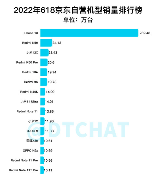 得益于价格策略,iPhone13系列一经发布便在中国市场的广受追捧。根据DTCHAT公布的今年618手机销售榜,iPhone 13销量断层式第一,是第二名销量的8倍多。