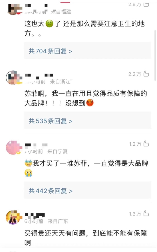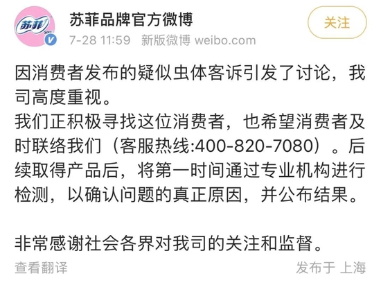 在微博平台上,#苏菲卫生巾被曝有虫子尸体#冲上热搜,引发网友热议,大部分女性网友对此表示担忧。