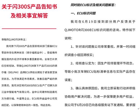 7月13日,钱江摩托在其公众号上发布《关于闪300S产品告知书及相关事宜解答》(以下简称《解答》),《解答》称,经核查认定:因生产现场管理环节疏忽,导致小批车辆ECU贴标清单信息与实际产品存在误差。